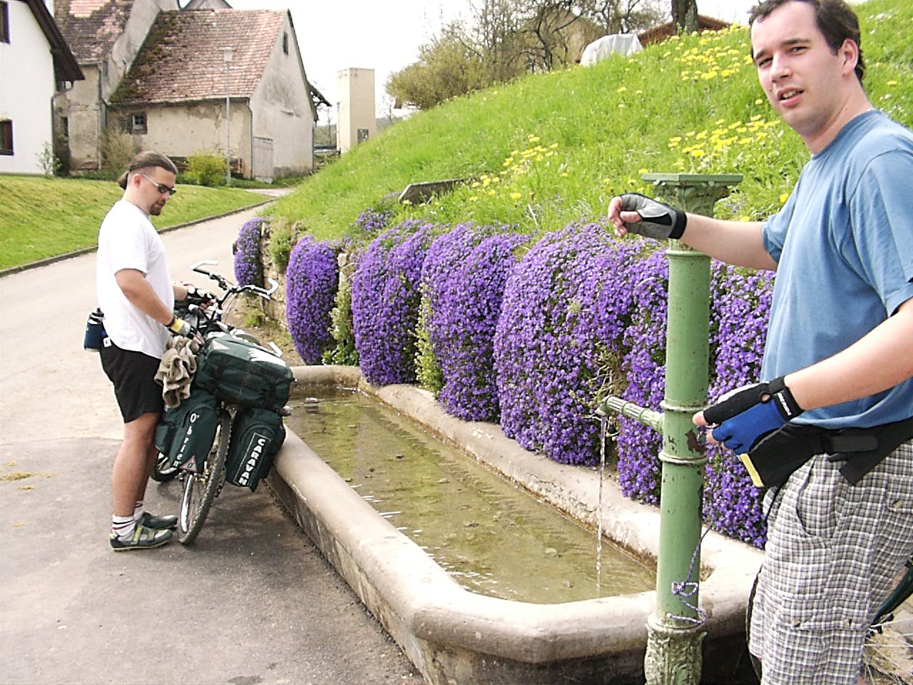lecuccoltunk, hamar megtalaltuk a duna forrast, nem egy nagy szam... az ido egy kicsit jobb, mar ettunk is. a biciklik kurva nehezek, szinte a levegoben all az elso kerek...na jo nem de tenyleg durva. donaueschingen klassz,megyunk mindjart tovabb.