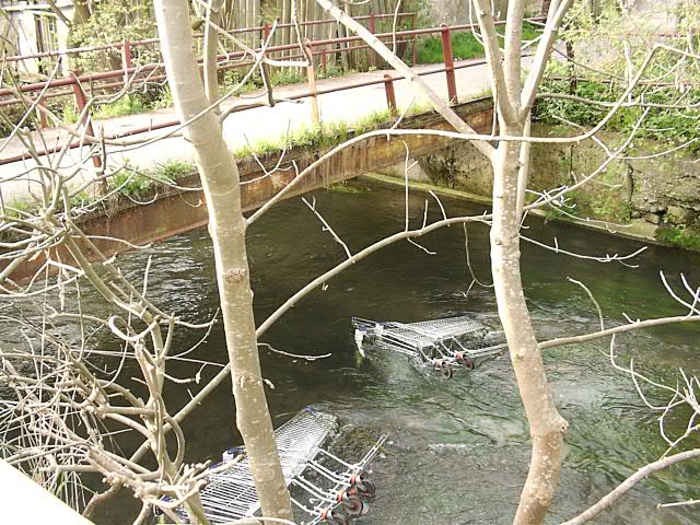 Ejszaka nagy buli lehetett. A foteren a szokokutban egy tv figyelt. az egyik bevasarlo aruhaz melletti patakban pedig a bevasarlo kocsik kandikaltak ki.